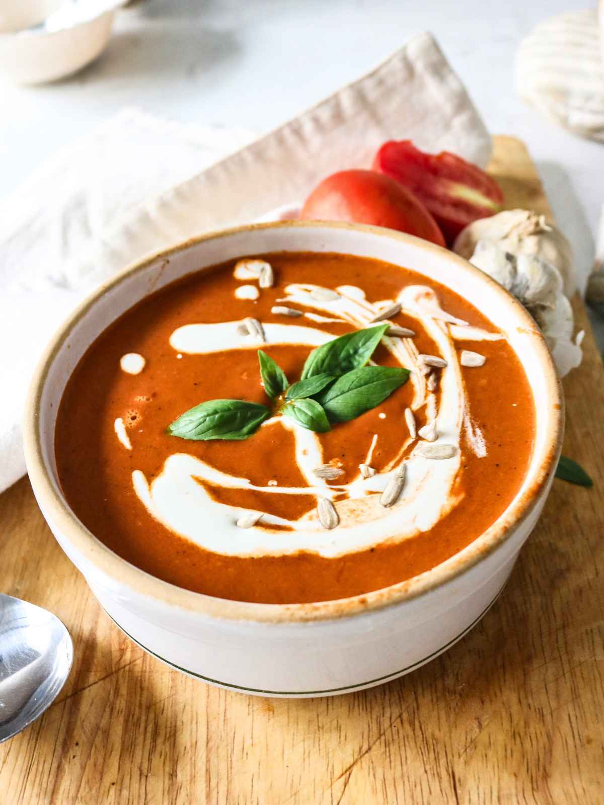 - Ladle into bowls, swirl in cream, and garnish with basil leaves and sunflower seeds.